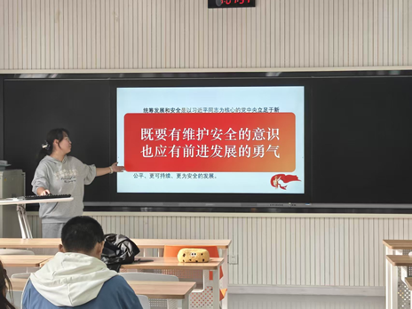 班会伊始,吴佳颖首先介绍了“几届几中全会”的基本概念及其在党的治国理政中的重要地位,帮助同学们构建起清晰的认知框架,为后续学习奠定了基础。随后,同学们共同学习了党的二十届四中全会的基本概况与主要议程,通过团支部书记的介绍,同学们对会议的时代背景、重大意义及其在国家发展进程中的关键作用有了更为全面的认识。紧接着,活动聚焦会议的核心要义,重点围绕“发展与安全”这一时代主题进行了深入学习和探讨。大家深刻认识到,推动高质量发展与维护高水平安全是相辅相成、辩证统一的,是新征程上必须牢牢把握并贯穿始终的重要遵循。